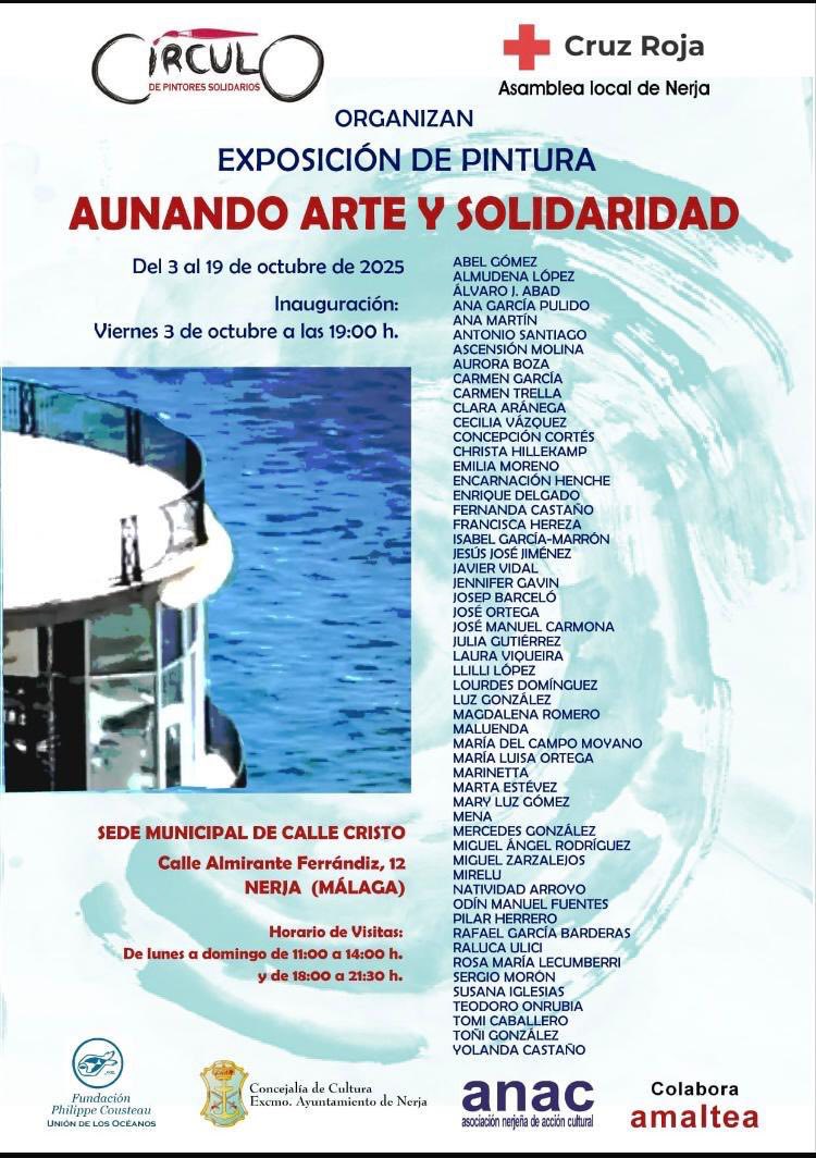 Exposición colectiva «Aunando Arte y Solidaridad» del Círculo de Pintores en la Sala de Exposiciones Calle Cristo de Nerja. La exposición tiene un fin benéfico a favor de Cruz Roja de Nerja y se podrá visitar del 3 al 19 de octubre. Participan 54 artistas.